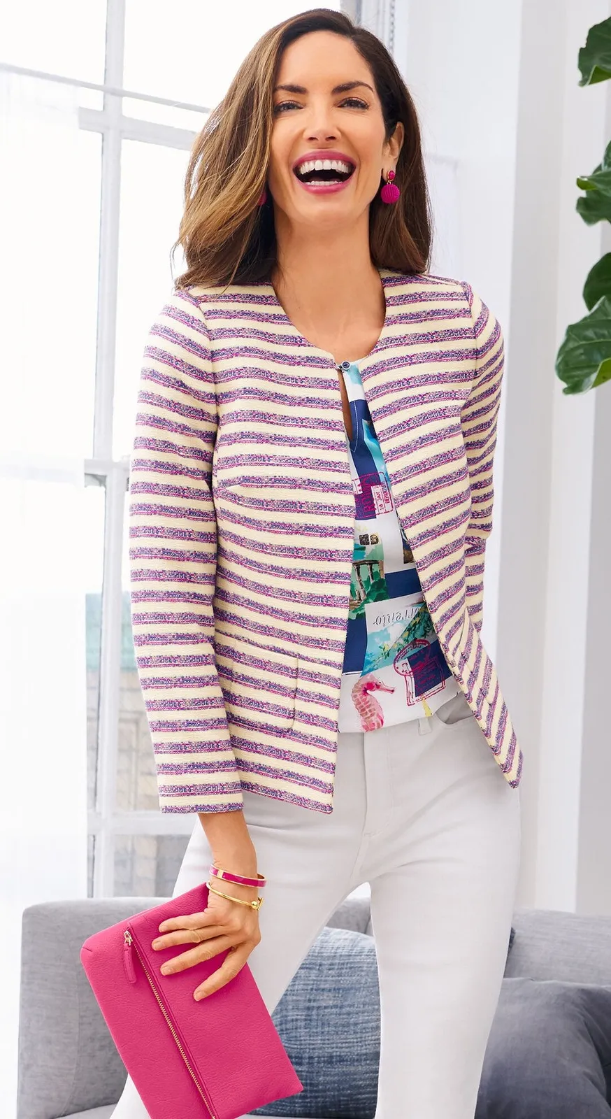 Keywords: Talbots, Petite, Blazer, Jacket, Striped, Tweed, 3/4 Sleeve, Career, Business Casual, Womens, Size 16P, Open Front, Collarless, Tweed, Stripe, Open Front, Lined Jacket, Career Wear, Business Casual, Work Blazer, Smart Office, Spring Fashion, Layering Piece, Polished Look, Cotton Blend, Classic Style, Lightweight Jacket, Preppy Chic
