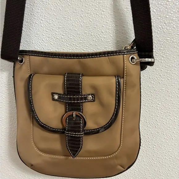 Stylish crossbody bag by Talbots. Features a tan body with brown accents. Front pocket with buckle d... Show more