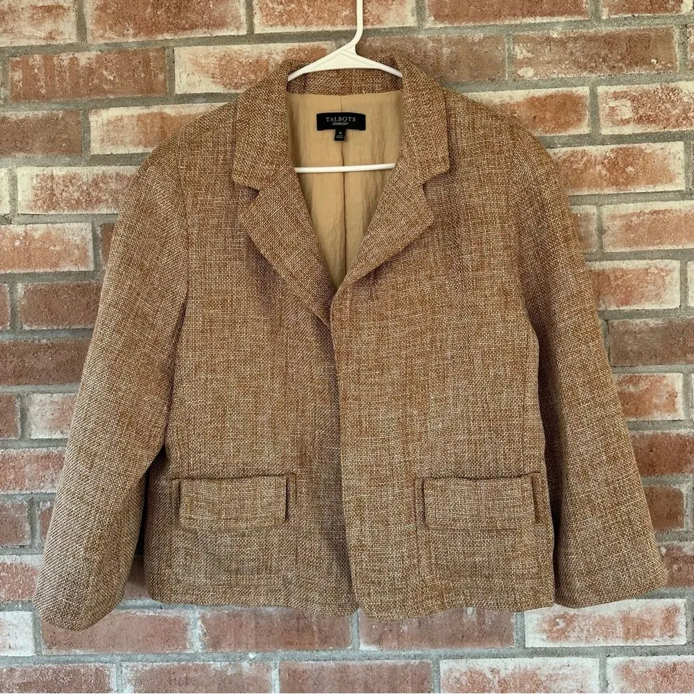 Women’s size 16 Talbots twill tweed blazer jacket. 3/4 sleeve, pockets in the front. Linen blend mat... Show more