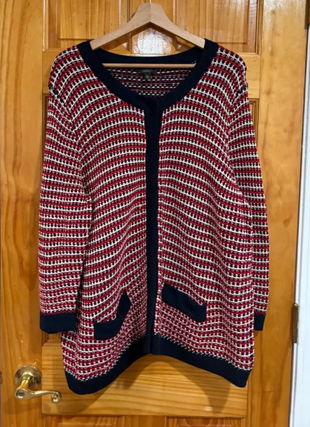 Classic and timeless Talbots knit cardigan in a red, navy & ivory textured weave. Open-front style w... Show more