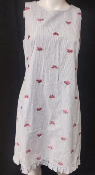 Offers a sleeveless knee length styled shift dress with striped design and watermelon embroidery. Ma... Show more