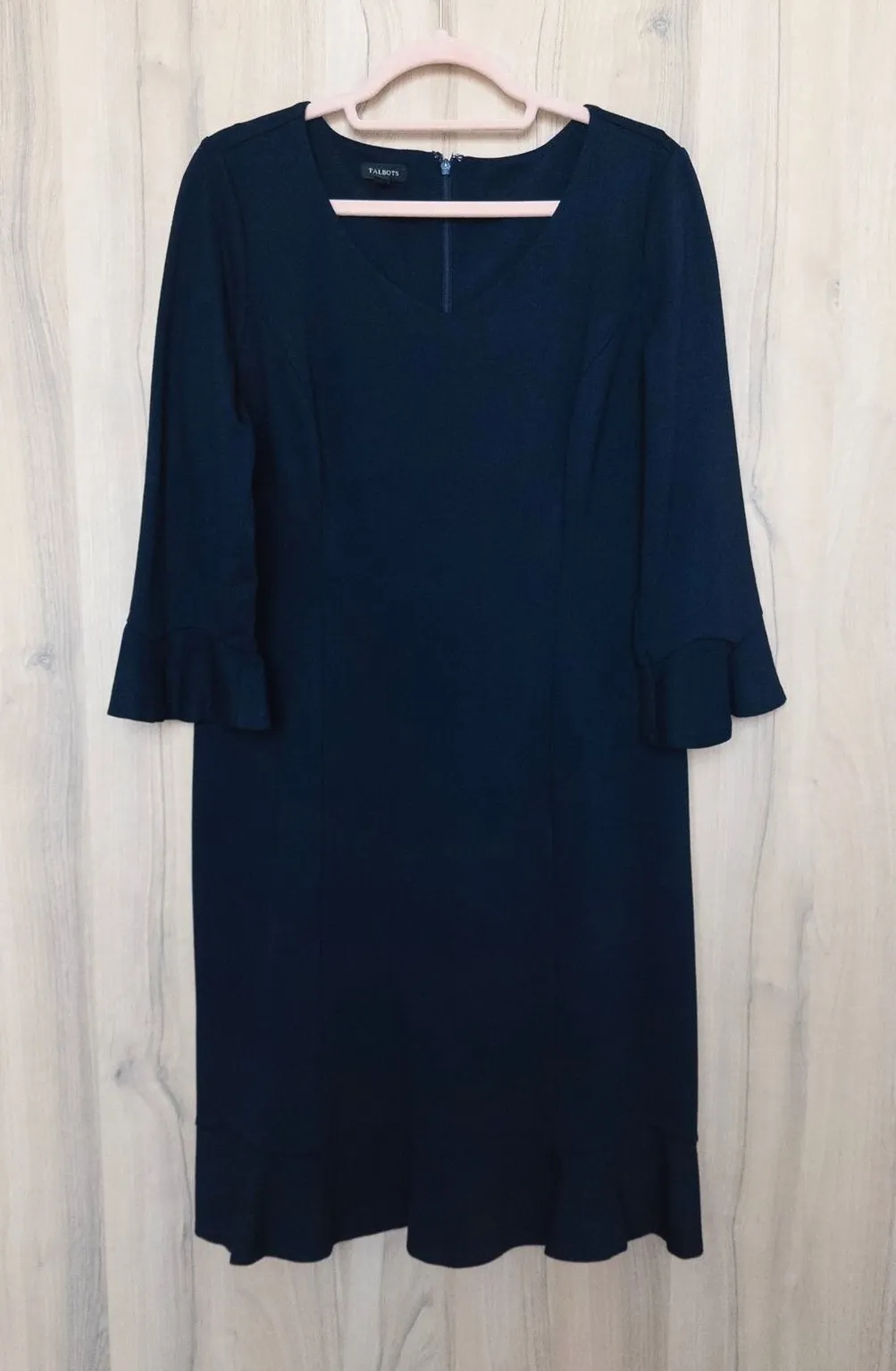 Talbots navy blue v-neck dress with 3/4 length sleeves and subtle ruffle details on the cuffs and he... Show more