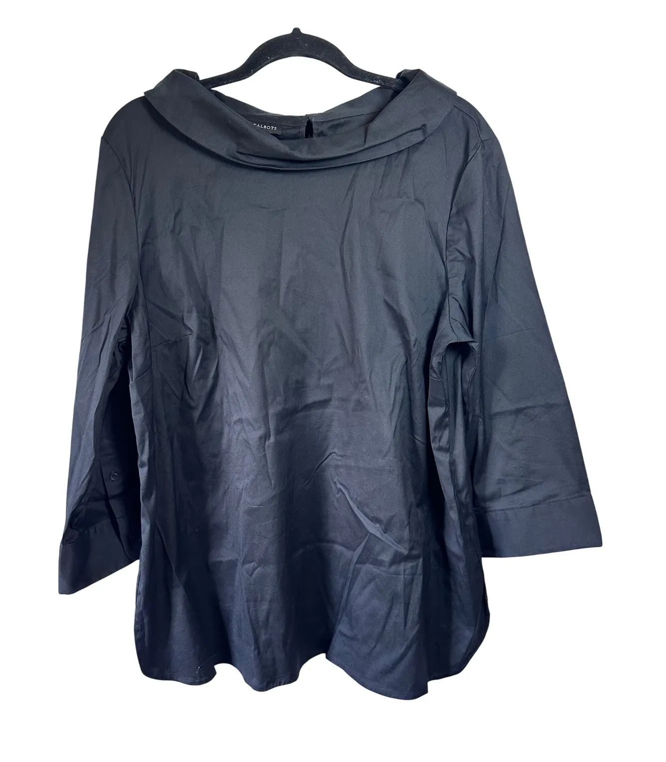 Keywords: Talbots, black blouse, cowl neck, 3/4 sleeve, button cuff, casual top, womens top, XL blouse, career wear, office attire, classic blouse, contemporary top, minimalist fashion, easy care, cotton blend