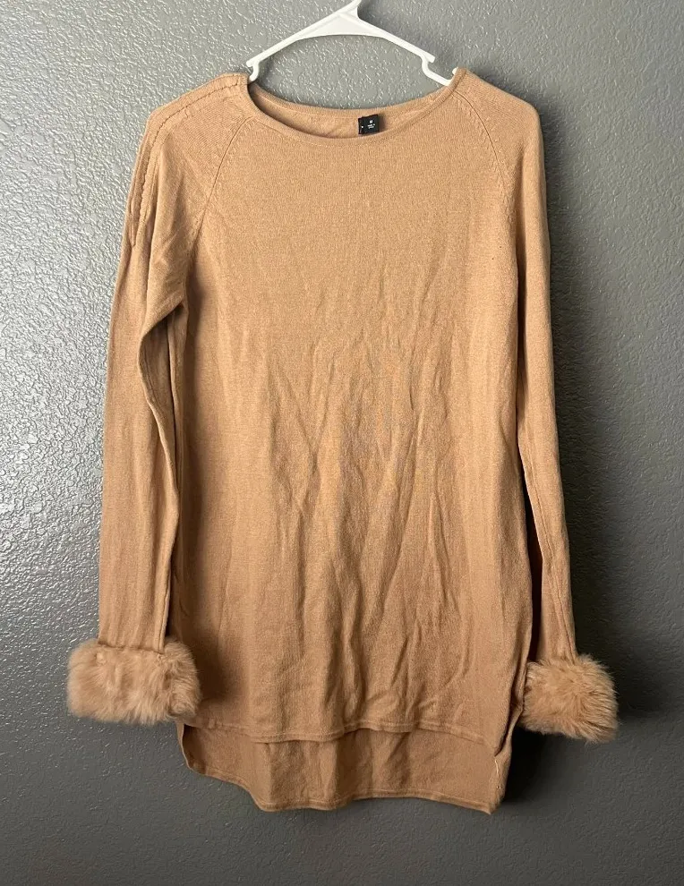 Fashion Style: Chic, Cozy, Glam, Casual Glam, Tunic Top Length: 28 inches P2P (Pit to Pit): 19 inches Materials: (No tags. Likely an acrylic or polyester blend for the knit, with faux fur trim.) No brand or material tags. Prominent faux fur cuffs. High-low hem.