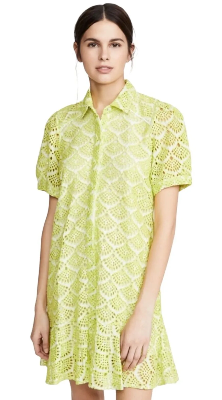 Pre-owned. No flaws. Smoke free home. Across chest 19'' Length 34'' Tanya Taylor yellow lace shirt dress featuring a button-front closure and short sleeves. This charming dress has a classic collar and a playful ruffle hemline. The intricate lace overlay reveals a white lining, adding depth and texture to the design. The garment is crafted from 100% cotton for both the self and the lining. Style: Shirt Dress Dress Length: Short Department: Women Sleeve Length: Short Sleeve Occasion:Party/Cocktail Material: 100% Cotton Fabric Type: Lace Neckline: Collared Season: Summer, Spring Keywords: Tanya Taylor dress, yellow lace dress, shirt dress, ruffle hem, embroidered, eyelet, designer dress, summer dress, day dress, preppy, feminine, lightweight