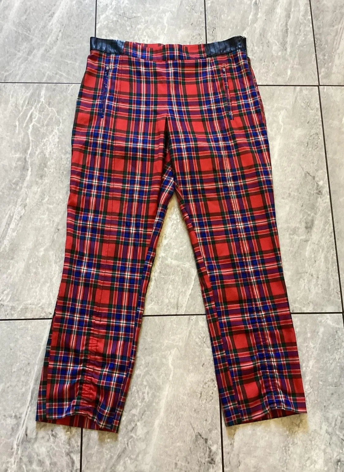 Brand: Tanya Taylor Item: Womens pants in a vibrant red tartan plaid with blue, green, black, and white accents Tag size: 10 Waist flat 16 Rise 11.5 Inseam 27 Features: Leather-trimmed waistband (tag notes genuine leather trim) Design details: Front zip pockets, flat front, tapered leg, ankle/cropped length Gently worn, no visible flaws noted. Leather waistband shows light natural creasing from normal wear. Zippers function properly and seams appear intact; colors remain vibrant. Labels: Interior size/brand label "TANYA TAYLOR 10" visible in photos Style: Statement plaid trousers with a tailored look suitable for dressy or preppy outfits Notes: Please review all photos for pattern, fit, and construction details