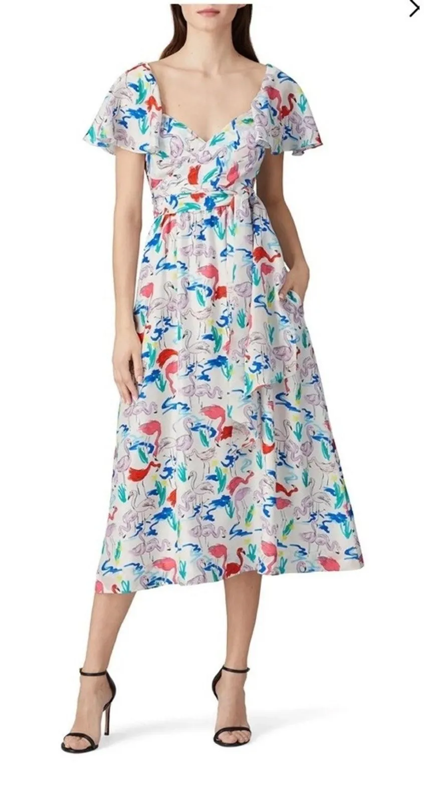 Party like a flock star in this feminine flamingo-printed silk dress from Tanya Taylor. White multicolor printed silk 100% Silk Short flutter sleeves Square neckline Hidden side zipper closure Fully lined Pockets Condition: some wear near back zipper but otherwise great used condition.