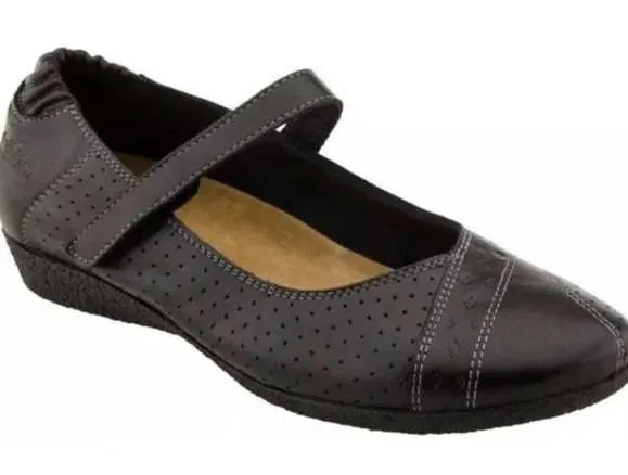 A pair of black leather Taos Mary Jane flats with perforated detailing. These shoes feature a comfor... Show more
