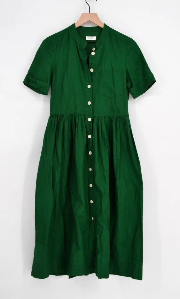 Taost Cotton Oxford Midi Shirt Dress in Racing Green. Size 8. Preowned condition. Please refer to photos for any signs of wear. Collarless Midweight soft cotton Gathered skirt Seamed waist Turned back cuffs Corozo buttons Patch pocket 100% cotton tags: picnic, market, wedding guest, summer, work to weekened