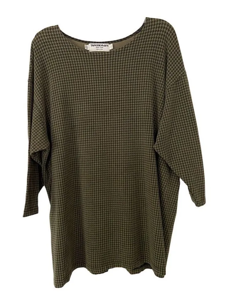 This TAPEMEASURE vintage tunic is a stylish and versatile addition to any wardrobe. Designed for women, it comes in an olive green and features a classic black houndstooth pattern. The tunic is made from a blend of acetate and polyester, ensuring both comfort and durability. It has a boat neck and dolman sleeves, making it suitable for various occasions, whether casual outings, work, or social gatherings. The tunic is a size L with an oversized fit, and it is proudly made in the United States.