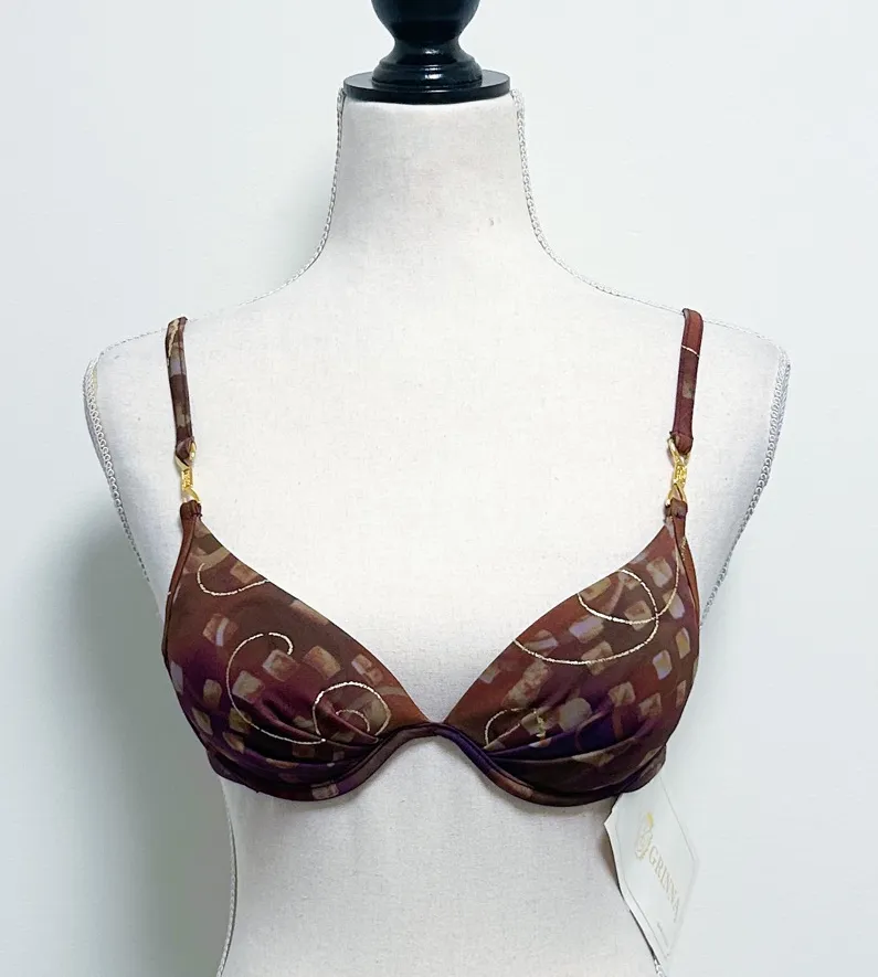 Swimwear Brand: Tara Grinna Size:32 AA-B (**please see photos for approximate measurements as bathing suits tend to runs small. I feel this would fit AA or A cup best**) Style: Underwire bikini top with thickly padded cups. Brown, purple and perwinkle abstract pattern with metallic gold accents. Gold tone hardware. Straps can be worn standard or cross back. Clasp back closure. Hand wash garment care. Condition: New old stock (NOS) with tags. Please be advised that the tags themselves show wear such as dents and discoloration. Comes from a smoke free home. Please feel free to ask any questions before purchase. I typically ship within 24 hours but please be advised that I don’t ship on Saturdays or Sundays. Thank you for understanding!