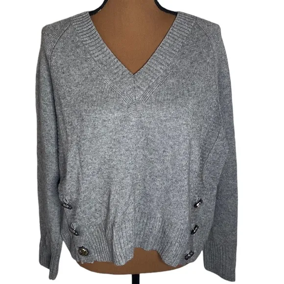 Tara Jarmon Promesse grey wool chunky knit button accent v-neck sweater Great used condition, size... Show more