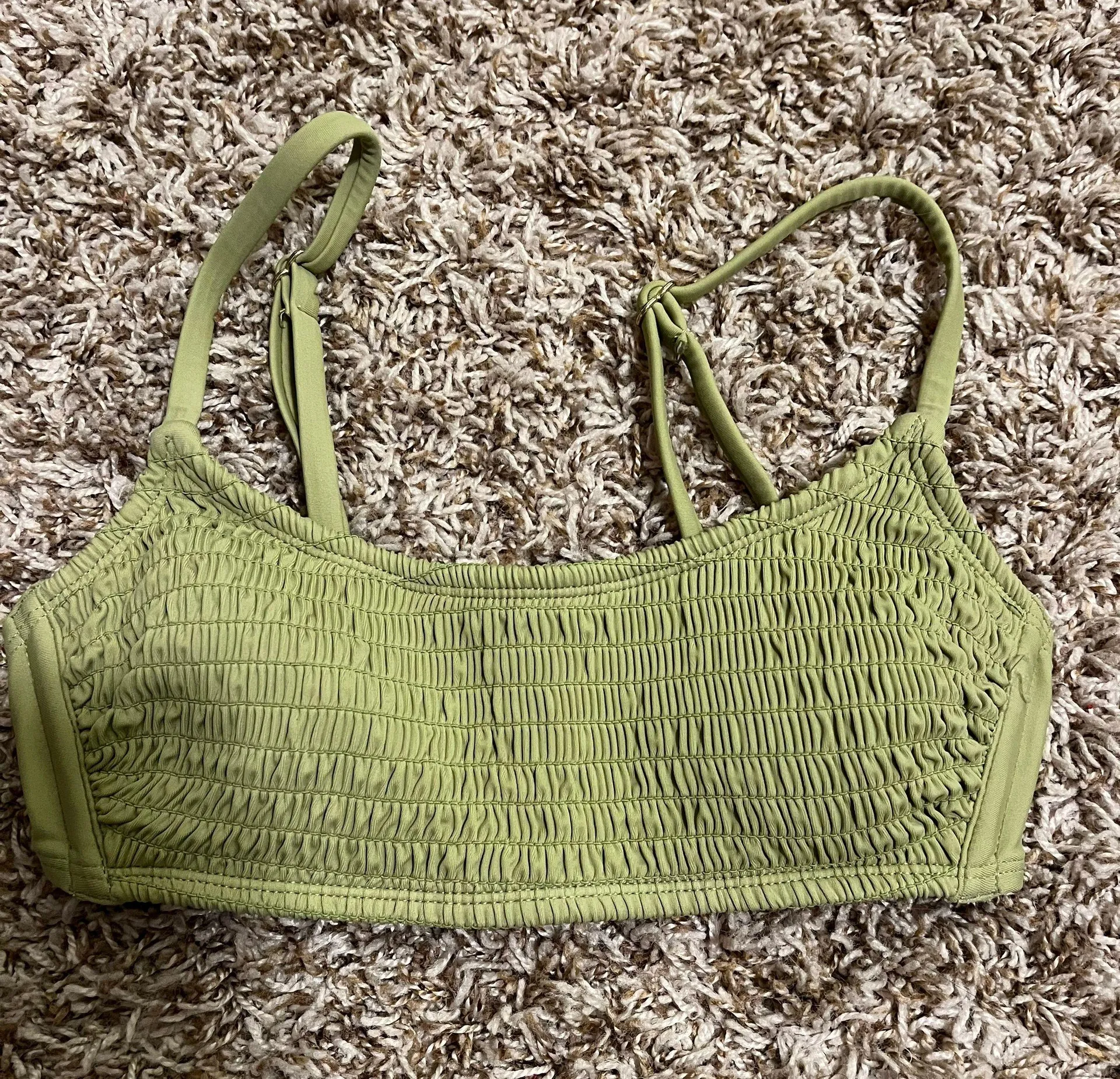 -green bikini top, worn a few times but looks brand new! -no flaws
