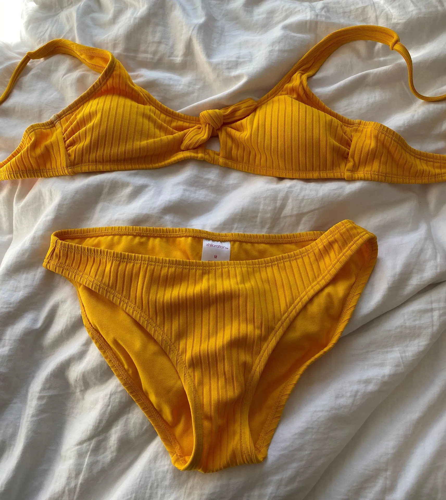 yellow, fake front tie top, full coverage bottoms, never worn
