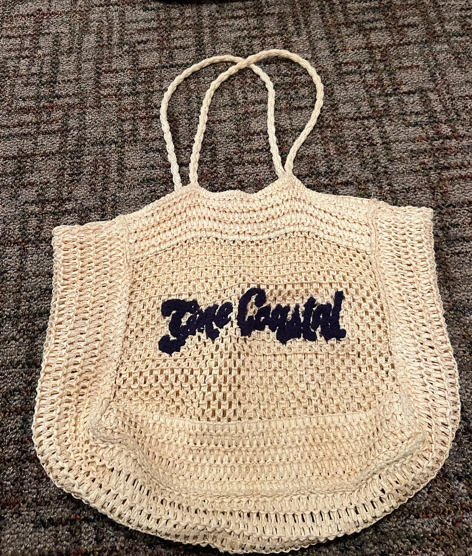 Stylish beige crochet tote bag featuring bold blue text. Perfect for casual outings.