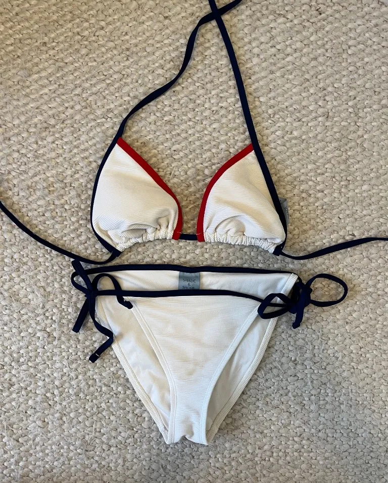 White Swimsuit with Red and Blue Details. Top is Size Medium. Bottoms are Size Small. INCLUDES Top P... Show more