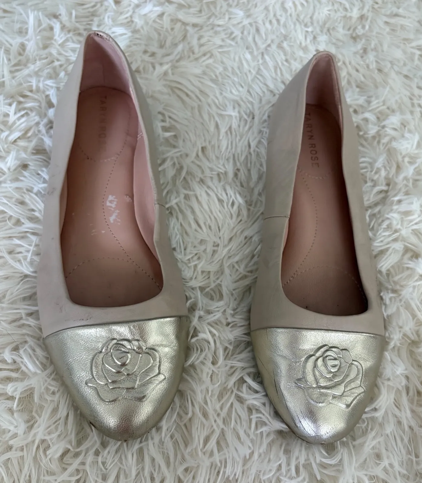 Elevate your everyday elegance with these charming ballet flats, a seamless blend of comfort and understated sophistication. Soft beige leather envelops the foot in luxurious comfort, while the captivating gold cap toe, adorned with a delicate rose embellishment, adds a touch of refined glamour. Their classic silhouette and thoughtfully designed footbed promise all-day comfort, making them a practical yet stylish choice. Step into effortless chic with these timeless flats, perfect for a casual brunch with friends, a day of exploring the city, or a sophisticated work environment. Style: Ballet Color: Beige Department: Women Upper Material: Leather Features: Cap Toe, Comfort, Rose Detail, Padded Occasion: Casual, Business, Workwear Closure: Slip On Lining Material: Leather Outsole Material: Synthetic Type: Flat Model: Rose Cap Toe Ballet Flat Keywords: Taryn Rose, Ballet Flats, Cap Toe, Leather Shoes, Beige Flats, Gold Toe, Rose Detail, Comfortable Flats, Women's Shoes, Slip On Shoes, Elegant Flats, Casual Flats, Work Shoes