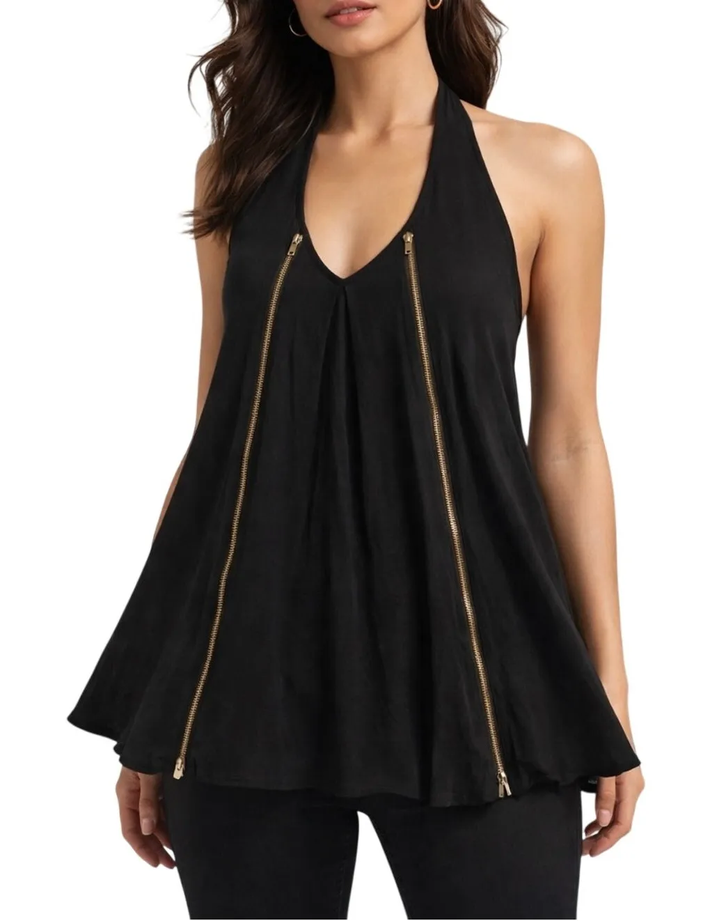 Excellent pre owned condition Halter neck Scoop neck Sleeveless Zip front and back details - zippers can be undone to make the top more flowy Flowy soft fabric 100% Viscose Hand wash cold AI Generated photo for styling purposes only pit to pit 16.25" Y2K revival, indie sleaze, downtown chic, euro girl, going out top, grunge luxe, dark feminine, minimalist edge, flowy halter top, zipper detail top Please see pictures for condition detail, style measurements/sizing tags and compare to something you already own to ensure desired fit