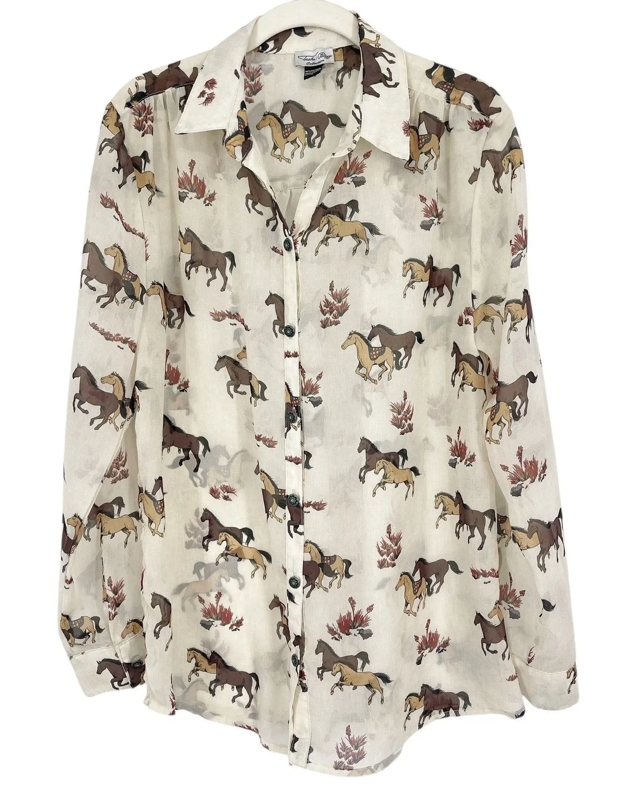 Tasha Polizzi Cecily Horse Print Button Down Blouse in a size large - excellent preloved condition! Natural sheer long sleeve button up top Horse and prairie brush print throughout Pewter concho buttons with a turquoise center Subtle ruffle detail back yoke V-neck Concho button cuff Slightly rounded back hem western chic, cowgirl core, heritage western, ranch style, vintage western vibes, equestrian aesthetic, desert boho, Americana fashion, rodeo inspired, statement blouse, southwestern style, westerncore, novelty print, collector piece, boho western, coastal cowgirl 5482