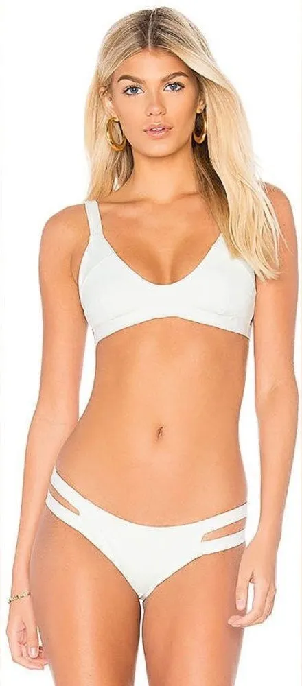Tavik White Coco Scoop neck bikini top and bottoms Large / XL Very good used condition. I got compliments every time I wore this cute set but the top is just a bit too small for me. Best for a D cup or smaller. Tops is an XL Bottoms have moderate coverage. Size L. I think the style is called tan lines Was sold at revolve and Anthropologie