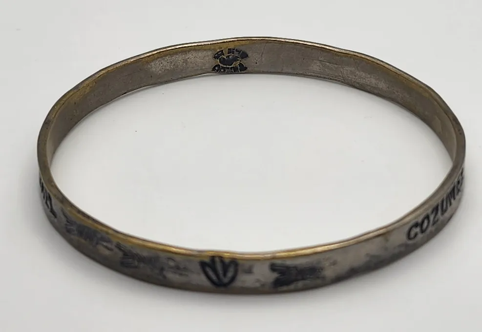 Taxco Mexico southwestern style silver tone and bronze bangle bracelet with COZUMEL, fish, & leaves stamped into it. Size: 8" Stamped: Taxco Mexico Most jewelry items are not tested, unless it is specified in the listing that it has been tested, all other items are described only by the stamps and markings, which I am happy to show pictures of.