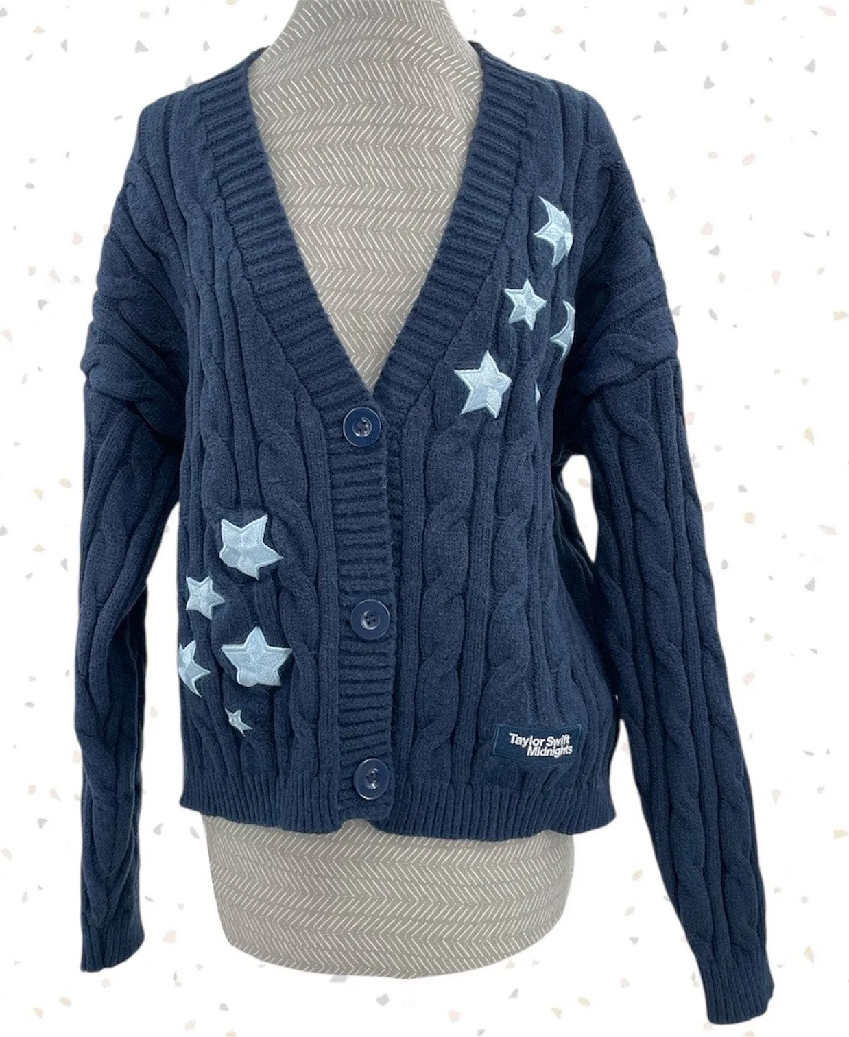 Wicked soft and cozy, this limited edition cardigan has a chunky oversized cable knit and a ton of silvery blue embroidered stars. So pretty. Some pilling / wear to fabric. See closeups. Nice used condition otherwise. Taylor Swift size M / L Approx: 23” pit to pit 23” front length