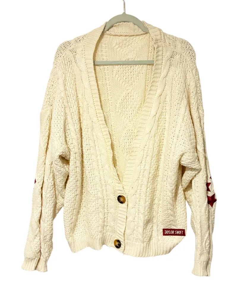 Taylor Swift Cream Chunky Knit RED Cardigan Star Patches VNeck Sweater Med/Large Size undefined - $68 - From Nacole