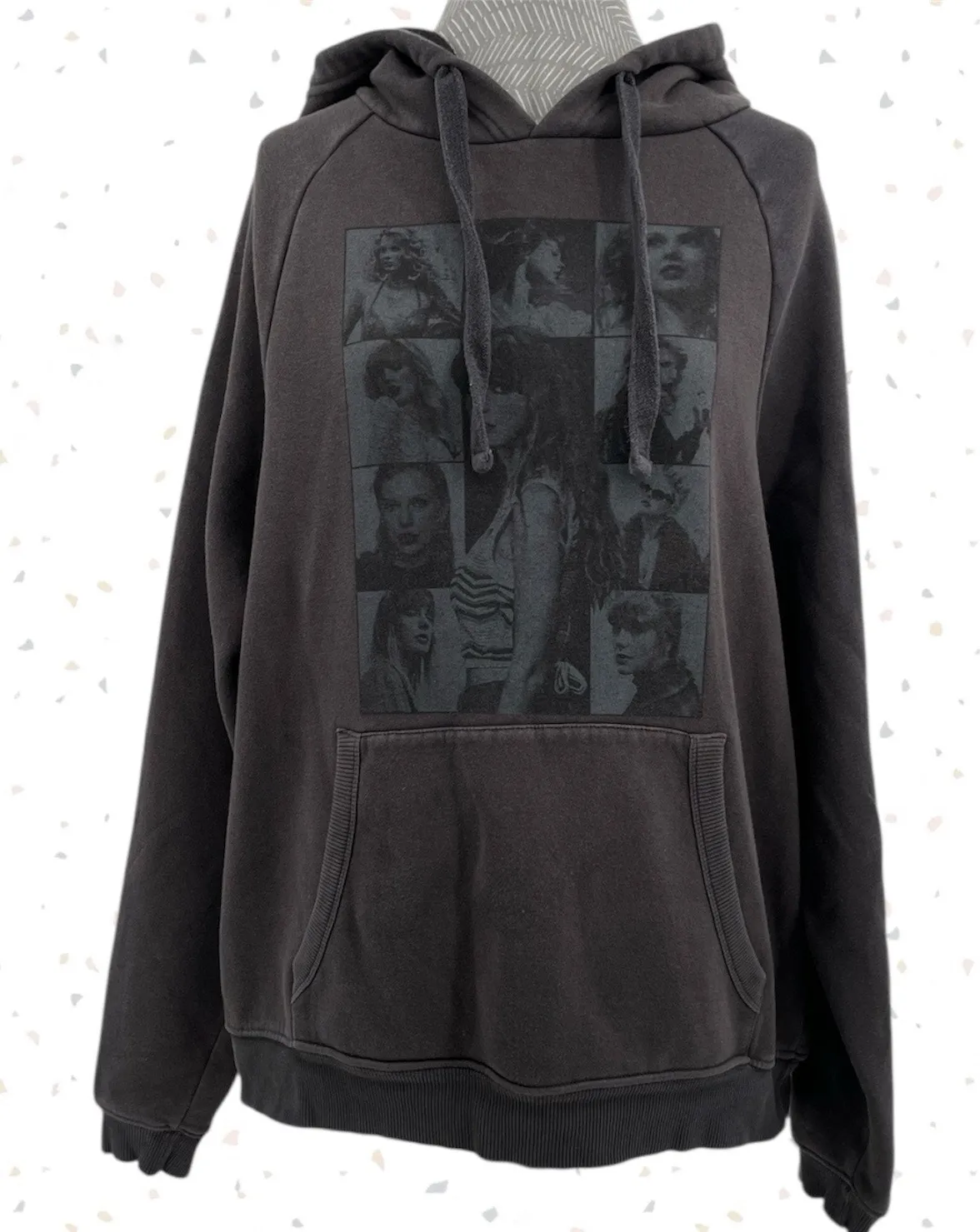 Comfy casual and perfect for a snuggling up on a chilly day, this oversized hoodie is a faded washed out charcoal black color with the Eras images on the front, concert dates & albums on the back, Taylor Swift down one sleeve and The Eras Tour down the other. Official tour merch from the Minneapolis concert. Hoodie is faded, has some spots and wash-wear, and one snag under one arm. Print down one shoulder is almost entirely faded away. See pics. Taylor Swift unisex size S Approx: 24” pit to pit 26” front length