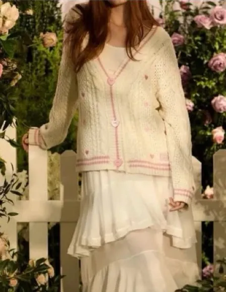 Taylor Swift Lover Album Heart Embroidered Cable Knit Cardigan in excellent preowned condition, no flaws. Size M/L, measurements are shown in photos. - Cream - White chunky cable knit cardigan with pink embroidered hearts throughout. - Oversized - V-neck - Pink heart shaped buttons - Ribbed knit cuffs and hem with pink stripes - 50% Acrylic, 50% Polyester Tags: lover cute coquette girl girly feminine merch romantic casual cozy light academia comfy swiftie eras