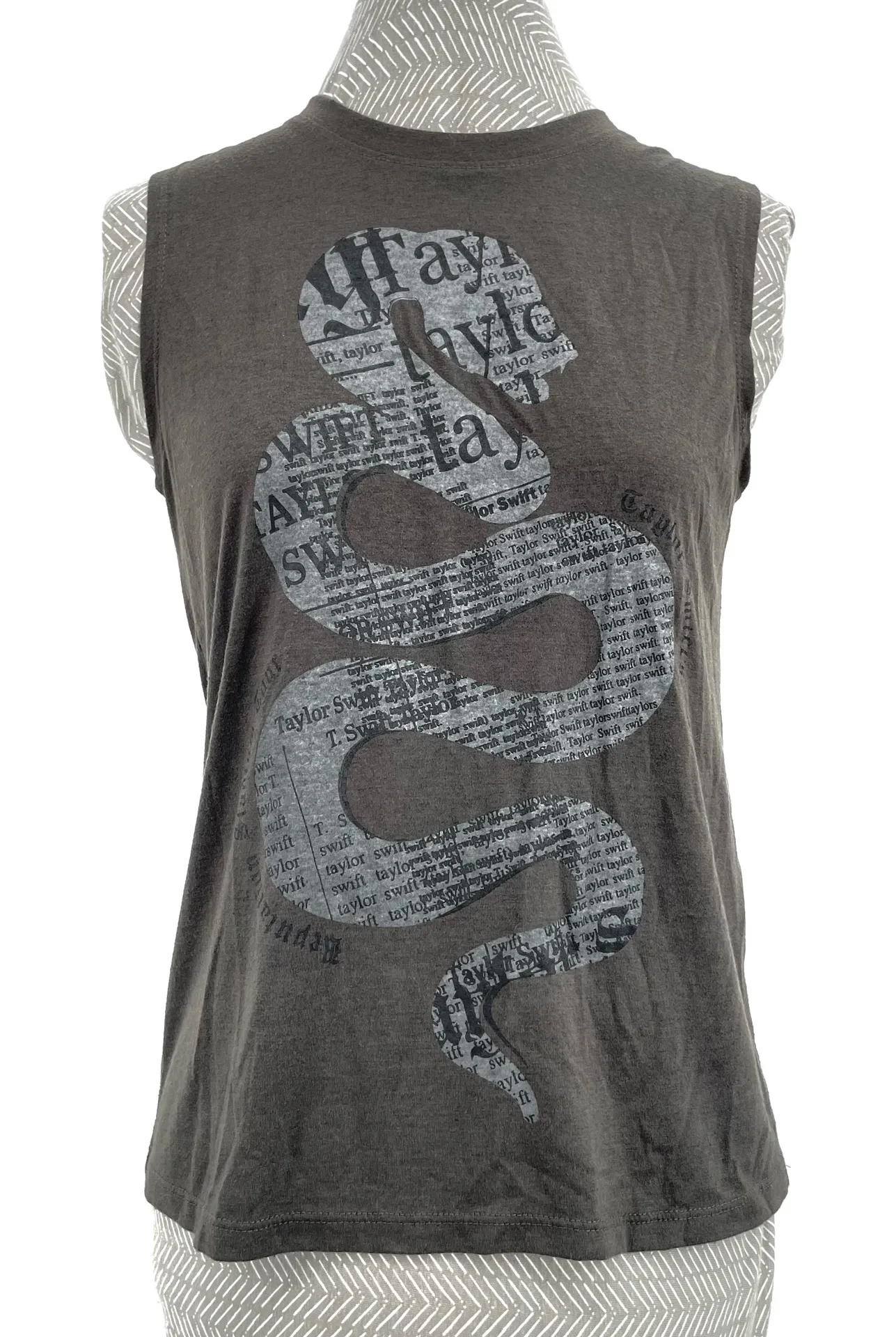 Totally fierce and the perfect piece for gym days to show off your upper body and shoulder gains! Dark gray sleeveless tank or muscle tee with the Reputation snake across the front and the 2018 tour cities on the back. The official merch listing called the color Charcoal but it’s reading gray with slight olive green undertones for me. Totally badass either way and a fun addition to your collection. Taylor Swift size S Tank is in good used condition with no noted flaws. Approx: 17” pit to pit 23” front length