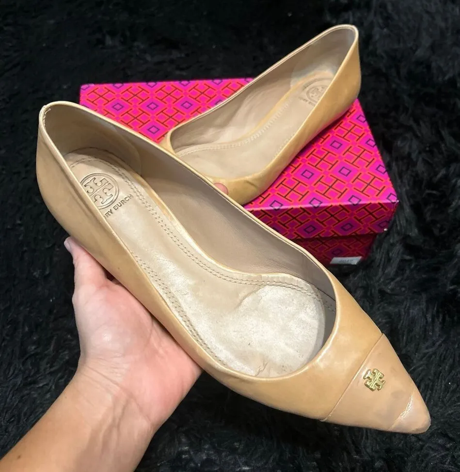 Authentic TORY BURCH Flats slip on shoes Pointed toe Gold logo Nude color Leather sole mat... Show more
