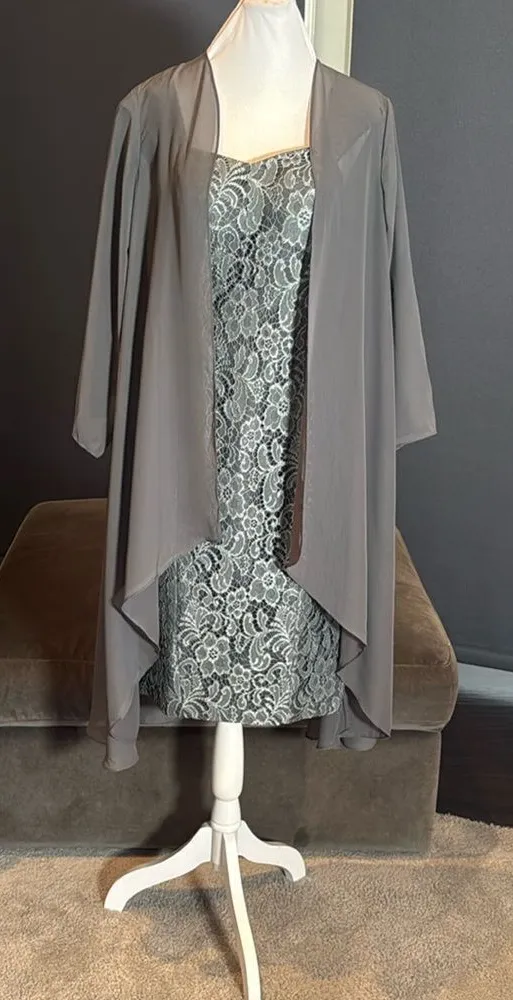 Women’s Tea Length Gray Floral Dress with a Matching Chiffon Jacket and Corset Back This dress is perfect for a Mother of the Bride, Mother of the Groom, Wedding Guest, Graduation, Party, Work Function, Formal or Special Event Beautiful eye catching color! Size 12 - please see pictures for approximate lay flat measurements. As the back is corset/lace up style there is room for size fluctuation/adjustment which is nice. I have it quit tightly laced in these pictures NWOT but has been tried on This dress is approximately 40 inches long from Shoulder to hem *Color is subjective and may vary based on lighting and device used to view this item 2037B197