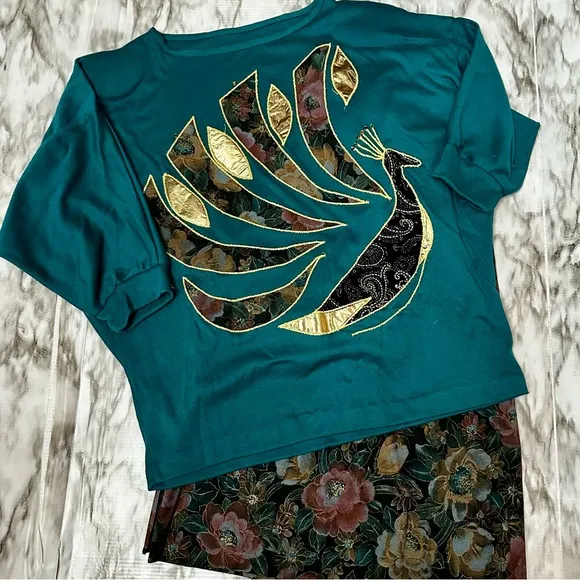Elegant teal midi dress with a striking gold peacock design. Perfect for any occasion. Please see pictures for details and condition. All measurements are approximate taken from flat lay. Top Sleeve 12 inches Pit to Pit 25 inches Shoulder to hem 24 1/2 inches Skirt Waist 15 inches Length 28 1/2 inches