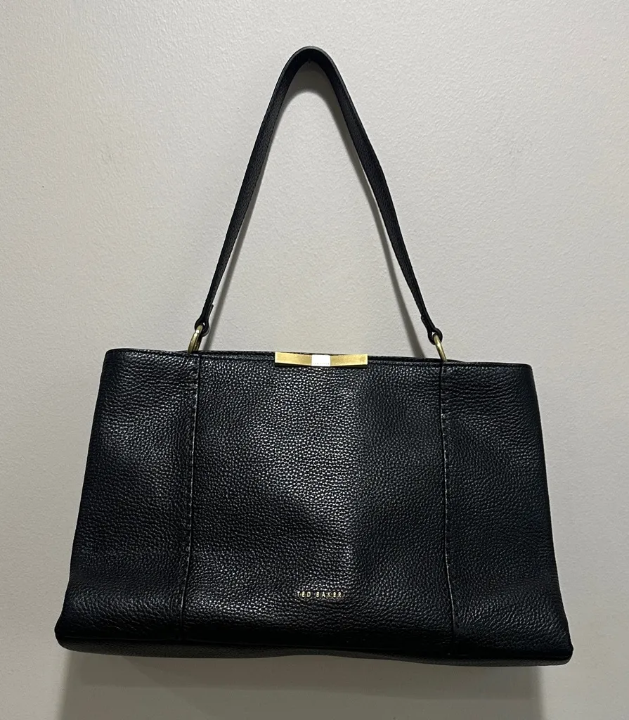 Elegant black leather bag with gold accents. Perfect for any occasion. Features a sleek design and c... Show more