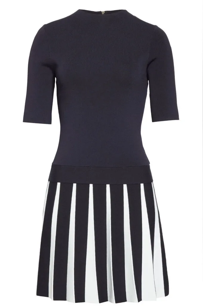 This is a chic Ted Baker London knit dress featuring a solid Black bodice with short sleeves and a striking pleated skirt with black and white vertical stripes. • Style: Fit-and-flare / Skater dress style • Details: Features a gold-tone zipper at the back with a signature 'T' pull. The fabric is a comfortable, slightly stretchy knit. • Color: Black and White stripes • Size: Ted Baker Size O. This is approximately equivalent to a US size 2 (please refer to Ted Baker's size chart for an exact fit). • Condition: Brand New no tags (NWOT) • Fabric Composition (from tag): 52% Viscose, 46% Polyamide, 2% Elastane. From the Care Tag: Hand wash cold, cool iron on reverse, dry flat Ted Baker, Ted Baker London, Knit Dress, Skater Dress, Fit and Flare, Pleated Skirt, Stripe Dress, Striped, Navy White, Navy Blue, Short Sleeve, Cocktail, Party, Event, Day to Night, Workwear, Business Casual, Designer, UK Designer, Viscose Blend, Gold Zipper, Size 0, US 2, Mini Dress. Measurements Length 35” Bust 15”