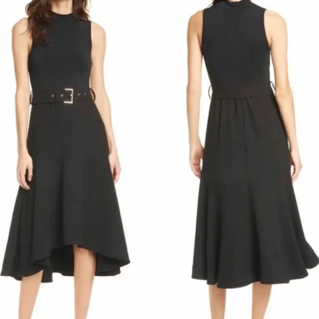 Large High neck Back zip closure Sleeveless Belted Fluted skirt Dip hem Designed to hit at calf 17"... Show more