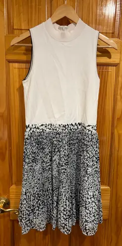 Chic and flattering Ted Baker London sleeveless dress featuring a solid ivory knit bodice with a black and white abstract pleated skirt. Size: 2 (US Small / UK 6) Color: Ivory top with black & white skirt Material: Textured knit bodice, lightweight pleated skirt Style: Fit & flare, mock neck, sleeveless, back zip closure Made in: China Condition: Excellent preowned — no visible flaws Elegant yet comfortable, perfect for work, brunch, or events. Signature Ted Baker tailoring gives this piece a polished, feminine look.
