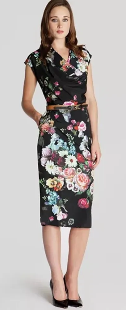 Ted Baker dress, Robyne dress, Ted Baker London, oil painting floral dress, black floral midi dress, cowl neck dress, pencil dress, garden wedding guest dress, floral sheath dress, classy work dress, cap sleeve dress, cocktail party dress, elegant midi dress, luxury floral print, Ted Baker size 1, UK designer fashion, women’s formal dress