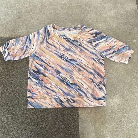 Tee Tahari Ombre Watercolor Stripe Cropped Short Sleeve Tee Shirt Super soft stretch Polyester Modal Elastane Machine wash and Dry Womens size Small Good Pre Owned Condition No visible flaws Approx Measurements: (Flat) Underarm seam to seam 20" Length 20"