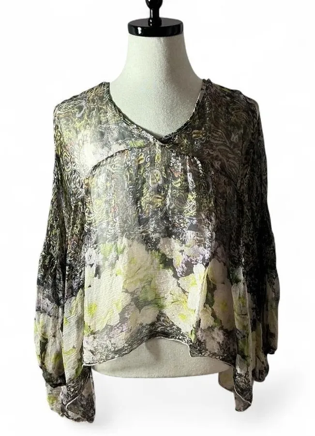 Tempo Paris blouse size L with a vibrant floral print. This elegant top features a flattering V-neckline and flowing long sleeves. Its relaxed silhouette makes it perfect for a casual day out or a stylish evening gathering. Keywords: Tempo Paris, floral print, V neck, long sleeve, flowy, bohemian, artsy, unique pattern, lightweight, casual, evening top, day to night #Casual #Vacation #RelaxedFit