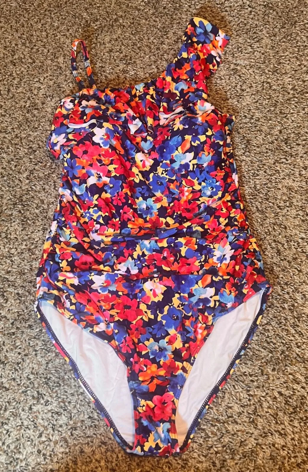 Stylish one-piece swimsuit, perfect for making a statement at the beach or pool. Features an all-over colorful floral pattern with a bold mix of red, blue, orange, and hints of yellow. The design includes a flirty one-shoulder cut with a ruffled detail along the neckline that extends gracefully across the bust. Offers moderate coverage and a flattering silhouette. Ideal for sunbathing by the pool, tropical vacations, or a casual day at the beach. Type: One Piece Color: Multicolor Department: Women Material: Nylon Swim Top Style: Tank Features: Ruffle Accent, One Shoulder, Tummy Control, Slimming, Moderate Coverage Pattern: Floral Accents: Ruffle Strap Type: Spaghetti Keywords: floral swimsuit, one piece swimsuit, one shoulder swimsuit, ruffle swimsuit, Tempt Me swimsuit, womens swimsuit, swimwear, poolside, beachwear, floral print swimwear, vacation, resort wear, swim fashion