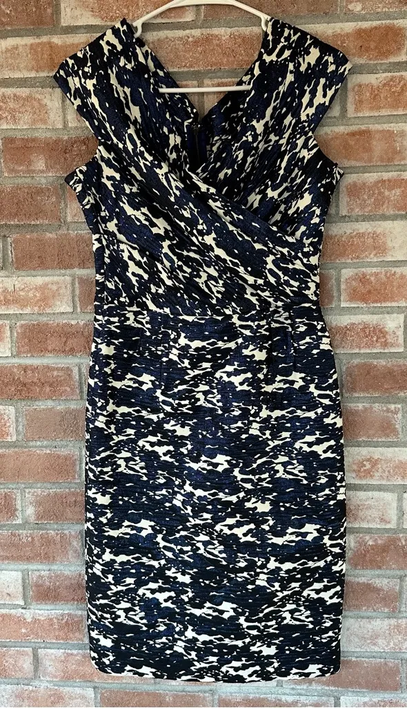 Women’s size 10 Teri Jon by Ricki Freeman off the shoulder midi dress. Criss cross neckline in the front, zips in the back. Small tear in the top layer by the back zipper (pictured) but blends in and doesn’t affect wear. Otherwise excellent condition! Approximate flat lay measurements: Pit to pit: 18in Shoulder to bottom: 39in