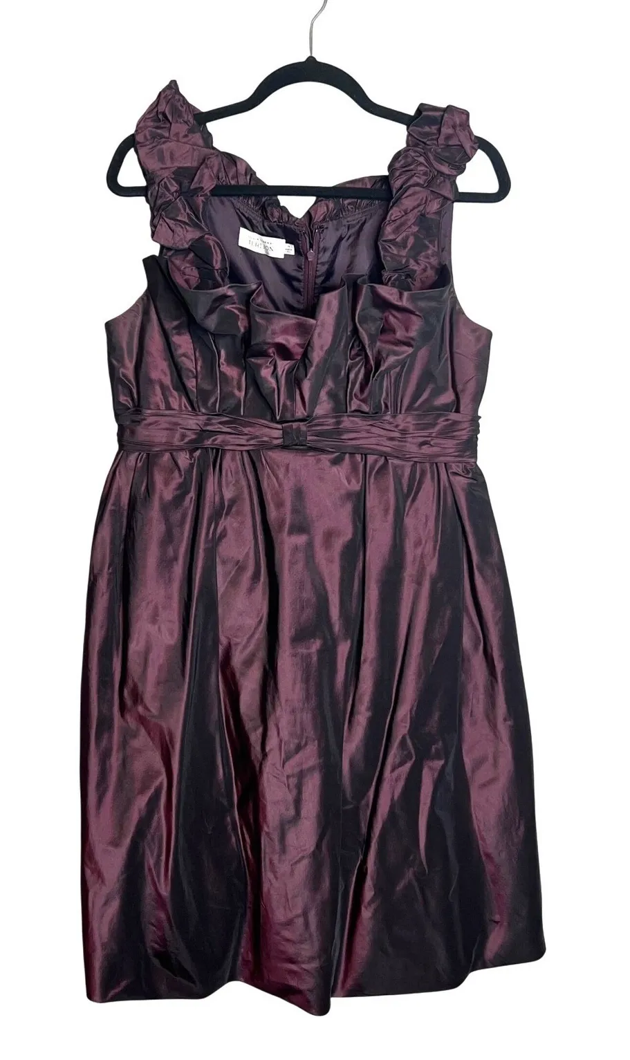 Elegant cocktail dress with a sophisticated design. This sleeveless dress showcases a unique neckline adorned with cascading ruffles, adding a touch of drama. A wide, gathered waistband accentuates the waistline, creating a flattering silhouette that falls into a classic knee-length skirt. Full lining for comfort. A back zipper ensures a smooth and secure fit. Perfect for a wedding reception, a formal dinner, or a special date night. Flatlay Measurements: bust 18" waist 16" length 39" Style: A-Line, Fit & Flare, Cocktail Dress Dress Length: Knee Length Color: Wine/Deep Purple Department: Women Sleeve Length: Sleeveless Pattern: Solid Occasion: Party/Cocktail, Formal, Wedding Material: Silk, 100% Silk Character: Elegant, Sophisticated, Glamorous, Classic, Special Occasion Fabric Type: Satin Condition: Excellent, no flaws! Keywords: Teri Jon dress, purple dress, silk dress, cocktail dress, party dress, ruffle dress, womens dress, size 14, formal dress, wedding guest dress, evening dress, knee length dress, sleeveless dress, fairy goth, fairygoth, whimsigoth, whimsygoth, fall cocktail dress, winter cocktail dress, gala We ship fast! Usually same or next day.