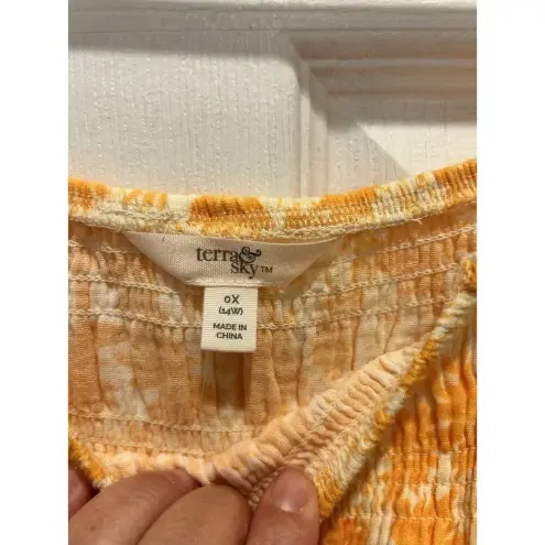 Terra Sky Fit & Flare Flutter Sleeve Smocked Dress Sz 14 0X Orange White Floral NWT. No flaws. Smocked bodice. Square neck. Large flutter sleeves. Pockets. Double cotton gauze material. UA to UA 19 Length 40 Measured flat and approximate