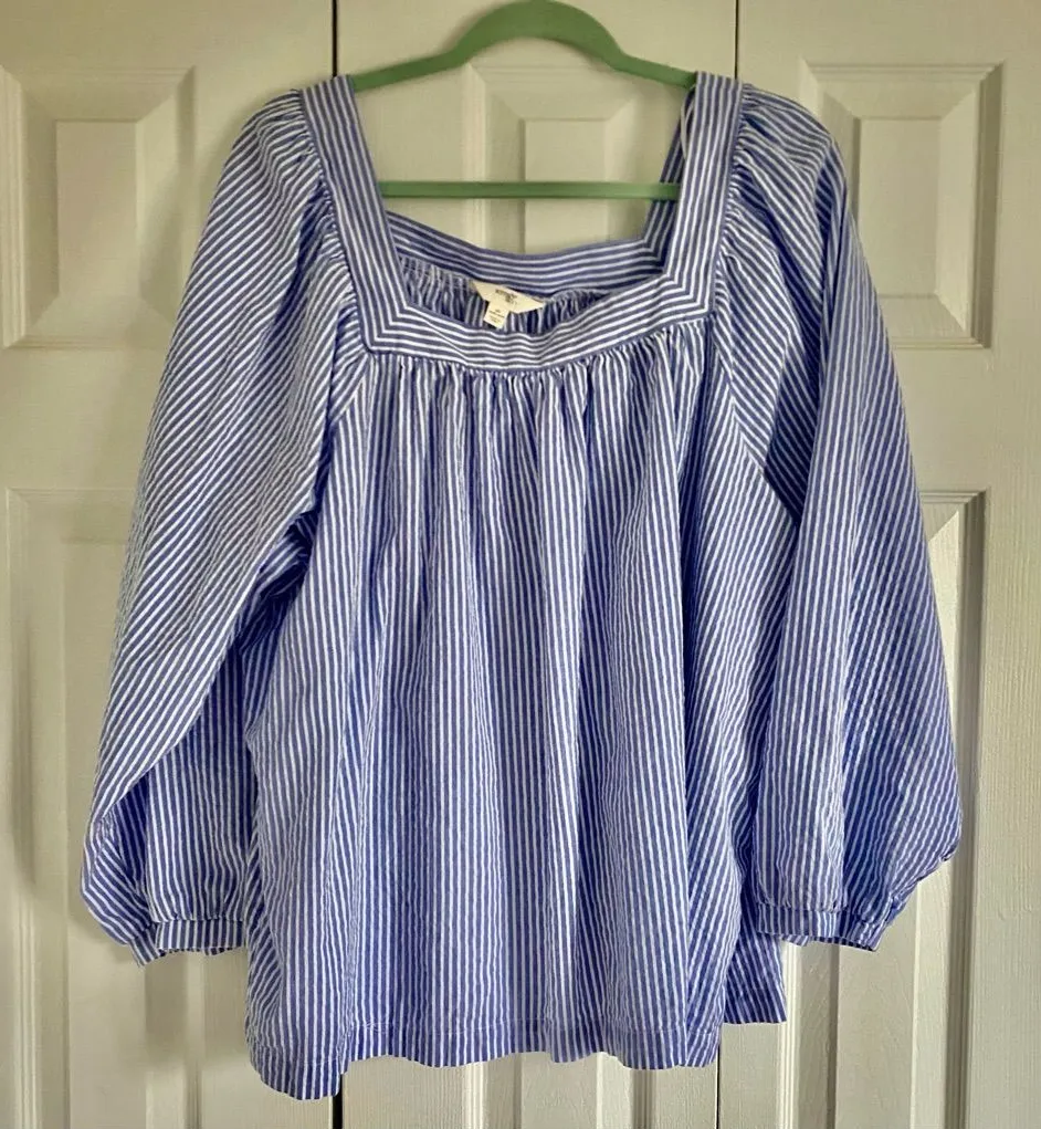 Features: Square neckline Lightweight, relaxed fit Blue and White Pinstripe 100% cotton Long sleeve loose puff sleeves with cinched top wrist cuffs Condition: preloved, excellent condition. Please view all pictures before purchasing. Measurements approx: Length: 26” Pit to pit: Sleeve: 26” Coastal, preppy, beachy, nautical, clean girl, casual