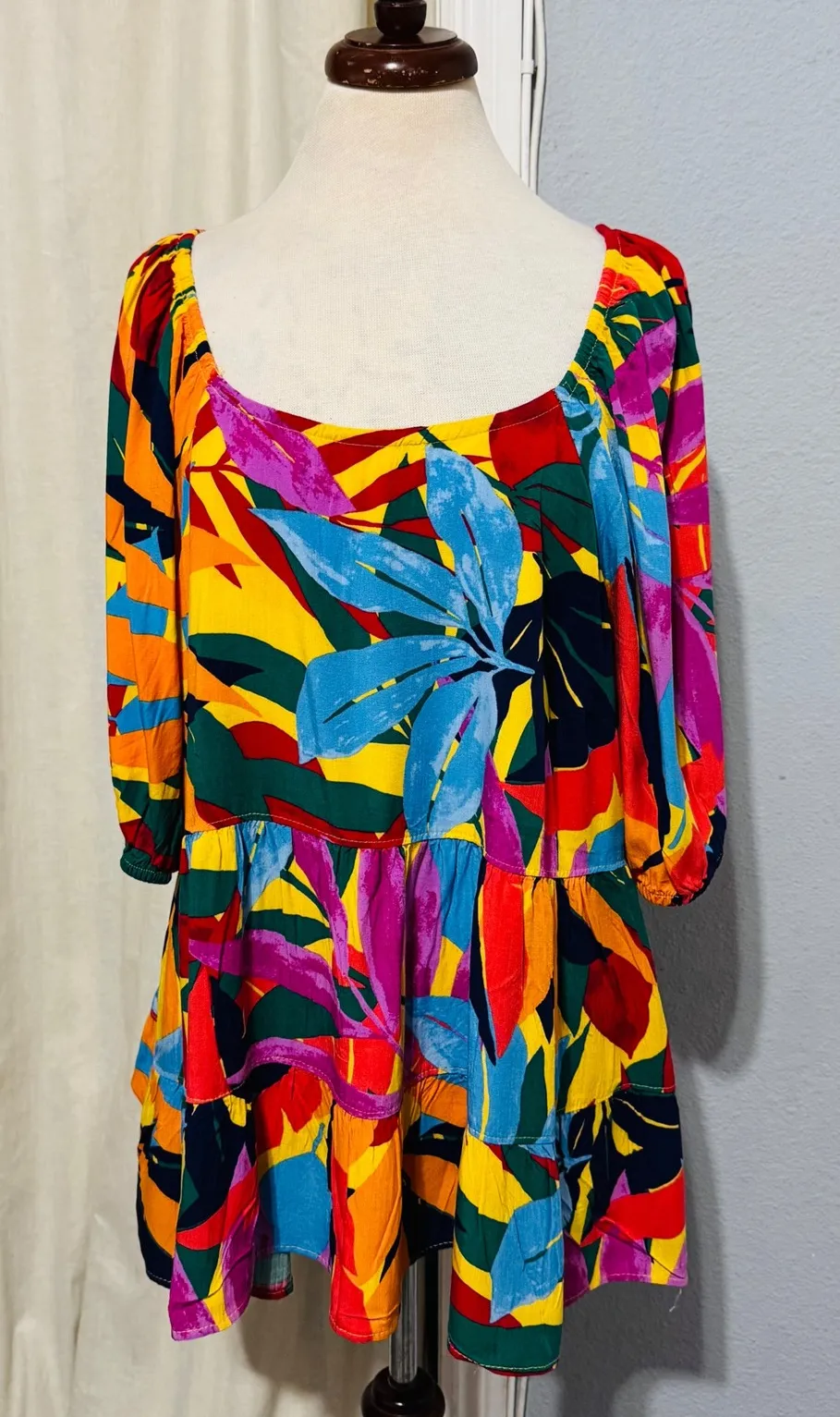 Vibrant tropical leaf print tiered ruffle mini dress tunic. Features a flattering square neckline, three-quarter length puff sleeves with elastic cuffs, and a tiered ruffled hemline that creates a playful silhouette. This versatile piece is perfect for beach days, vacation wear, or casual outings. Preowned- Good condition Measurements: • Bust: 44 in • Length: 29 in Type: Blouse Department: Women Style: Tunic Neckline: Square Neck Sleeve Length: 3/4 Sleeve Sleeve Type: Casual Sleeve Pattern: Floral Accents: Ruffle Theme: Hawaiian, Peasant Features: Tiered, Stretch Fit: Relaxed Fabric Type: Rayon Occasion: Casual Closure: Pullover Season: Spring, Summer Strap Type: Spaghetti Keywords: Terra Sky, tropical print, leaf print, tiered dress, ruffle hem, puff sleeves, plus size, vacation, beachwear, tunic dress, boho, colorful, summer dress