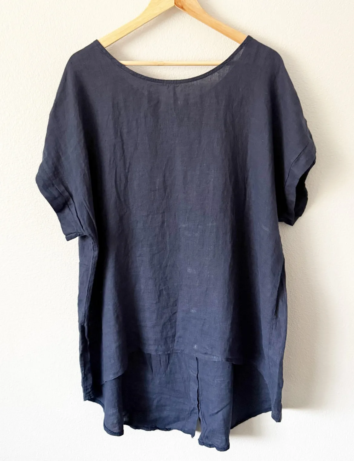 Beautiful navy blue blouse from TERZO MILLENNIO! Size 1X, worn once. Cuffed cap sleeve. Made in Italy. 100% Linen. Decorative button details on back, high-low hem. Approx. Flat Measurements: •Armpit to armpit...27" •Top of Shoulder to hem...29 front, 37" back •Top of shoulder to end of sleeve...11"