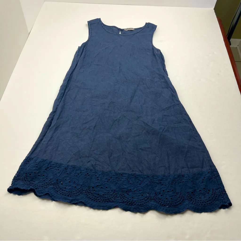 Terzo Millennio 100% Linen Sleeveless Shift Dress Eyelet Hem Women Size XS Blue Preowned in good con... Show more
