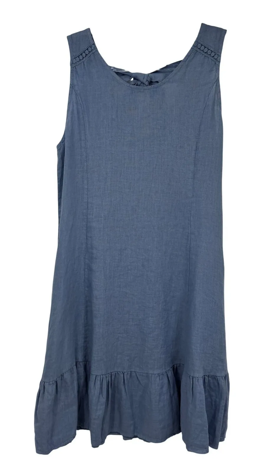 Discover effortless charm in this Terzo Millennio linen dress. A delicate bow tie at the back adds a touch of feminine allure, while the ruffled hem creates playful movement. Intricate crochet detailing adorns the neckline, elevating this piece with artisanal flair. Perfect for a breezy brunch, a charming garden party, or a relaxed vacation day. Style: Sundress, A-Line, Shift Dress Length: Knee Length Department: Women Sleeve Length: Sleeveless Pattern: Solid Occasion: Casual Material: 100% Linen, Linen Fabric Type: Woven Theme: Bohemian Neckline: V-Neck Season: Summer, Spring Sleeve Type: Strappy Sleeve Closure: Tie Accents: Crochet, Bow, Ruffle Excellent preowned condition - no rips, stains, or tears. From a smoke free, pet friendly home. Approximate measurements in photos. Seller Notes: -Same/Next Business Day Shipping -Smoke Free & Pet Friendly Home Keywords: linen dress, midi dress, sleeveless dress, bow back, ruffle hem, crochet detail, Italian linen, summer dress, resort wear, casual dress, women's fashion, travel dress, lightweight, breathable