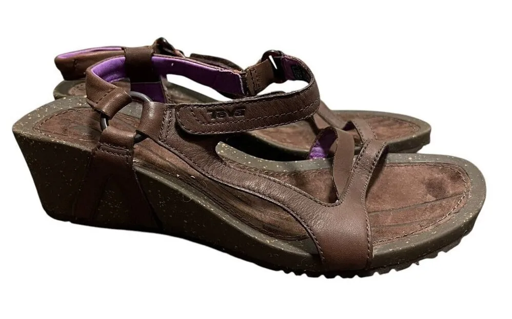Experience comfort and style with these Teva Cabrillo Women's Sandal Shoes. The strappy design with ankle strap and adjustable strap ensures a secure fit, while the mid-height wedge heel provides just the right amount of elevation for all-day wear. The hook and loop closure and rubber outsole make these sandals perfect for outdoor activities, travel, activewear, and casual wear. These sandals feature a solid pattern and are made of high-quality brown leather with a synthetic insole material. The Teva logo accents the shoes, adding a touch of athleisure to the overall design. These sandals are lightweight, breathable, and minimal in cushioning level, making them perfect for any season - winter, summer, fall, and spring. Get ready to step out in style and comfort with these Teva Cabrillo Women's Sandal Shoes.